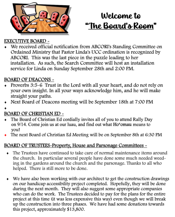 While I’ve enjoyed the slower pace of summer, I’m looking forward to the “big doings” in September and beyond. The first “big doing” is Rally Day on Sunday, September 14th. In the spirit of Rally Day 2025, I wish you a year of hoʿolana (hope) and aloha (love). Isn’t it wonderful that the Hawaiian word most often used to greet someone is a word that embodies the essence of love, affection, and peace.