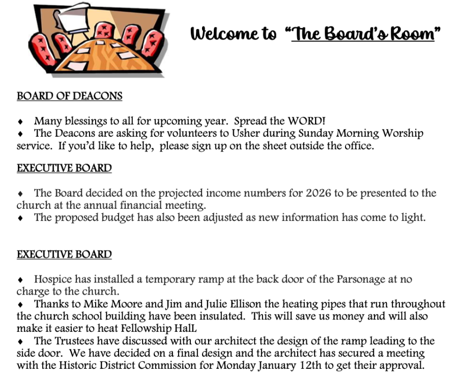 I know that for some of us, 2025 was a challenging year, and we may be grateful to see it come to an end, even as we know that the turn of the calendar doesn’t wipe the slate clean. Feelings and concerns may hold over into the new year. And for some, 2026 may bring new challenges. However, I know that as a church family, we will walk together into whatever the new year brings, holding each other in both our blessings and our concerns.