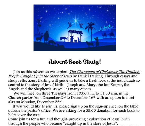 | Monday, December 22 | 10:00am | Optional Advent Bible Study |