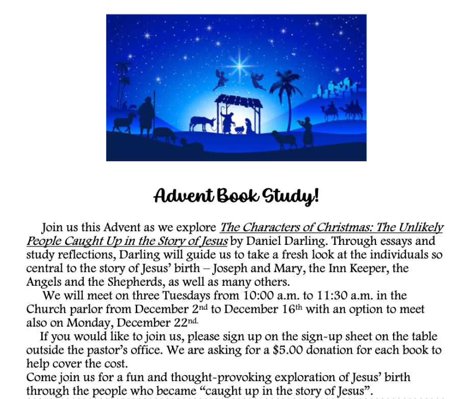 | Tuesday, December 9 | 10:00am | Advent Bible Study |